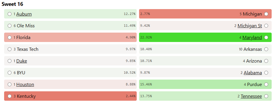But then I noticed something: their predictions were absolute garbage. The consensus of the betting markets and the top models was that Houston probably had about the third or fourth-best chance of winning the tournament at that time, a clear tier below heavyweights Purdue and eventual champion UConn. ESPN’s Basketball Power Index (BPI), which powers their projections, not only had Houston first, but saw them as unprecedented juggernauts, with a 37% of winning the tournament in the Sweet 16. Probabilistic forecasts are notoriously hard to evaluate in real time. “Hey, I said there was a chance!” the forecaster can always say. But this forecast was clearly wrong, it was wildly out of step with all other available information, and in fact, Houston got upset in their very next game. UConn won, as everyone else said they probably would.