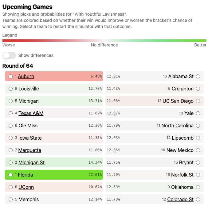 If you’ve filled out a bracket and entered into a pool, each game will feel like a life-or-death gauntlet. And of course it is. But some games are more equal than others. Should you be sweating that 10-7 upset that less than half your pool picked, even though you have that 10 seed losing in the next round? Or do you need to focus your energy on the 3 seed that you have breaking seed and making the Elite Eight? Everyone has that 3-seed winning this game though, so in the short term, it’s not going to help you move up in the standings if they win, and it’s not going to hurt you if they lose. And also, what if one of the brackets most similar to yours has that 3 seed making the finals? You now need that team to lose at some point before the Final Four if you want to win the pool. Is this the right time for that loss?