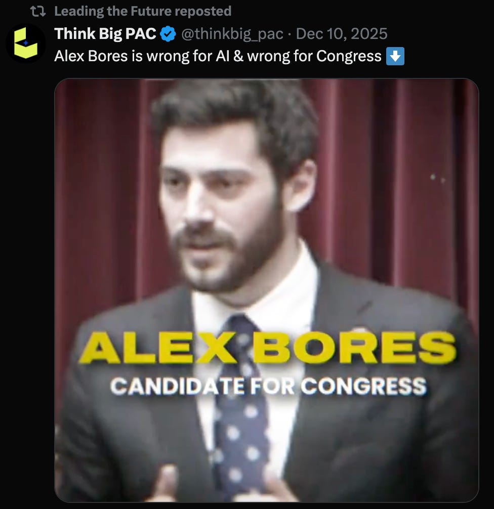 They’ve done so not because Bores has any grand plans for tax increases or expansions to social services, nor because he is a particularly fierce critic of Trump (he’s not a fan, of course, but no more or less than any other NY-12 candidate). No, Bores provoked their ire solely by sponsoring and advocating for a piece of state legislation called the RAISE Act, which imposes some basic guardrails on the AI industry’s activity in New York State. Like, very basic guardrails. AI labs that spend $100 million or more on research (right now, that’s Meta, Google, Anthropic, OpenAI, and xAi) that target New York consumers would have to publish a public safety plan, which they all already do voluntarily. And the Attorney General would be empowered to actually hold these companies to their plans, and sue for $1-3 million fines if they violated them. That’s it. Those fines amount to speeding tickets for these labs that are backed by trillion-dollar tech companies, which are all currently engaged in one of the biggest capex binges ever. New York can (after a lengthy legal battle against the world’s most expensive corporate defense lawyers) impose nominal, self-guided fines on companies that are trying to build robot overlords that might turn us all into paper clips, and for that, Alex Bores must be crushed.