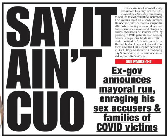 Adrienne Adams is probably not quite cooked yet, but the picture looks increasingly bleak for fans of hers, or for any other DREAM (Don’t Rank Eric or Andrew for Mayor) supporters. Cuomo’s lead in the polls has only grown since he entered the race; the most recent one has him in the 40s in a nine-person field. And with the Meeks announcement, his score on my endorsement tracker officially broke into triple digits, seventy points (equivalent to thirty-five City Council members, seven US House Representatives, or three and a half Chuck Schumers) ahead of Adrienne Adams in second place. It’s only grown since then. She could get endorsements from virtually every remaining prominent Queens Democrat and still end up with a less valuable set of endorsements than Cuomo has right now. And it’s much more likely that most of those remaining endorsers will support Cuomo, the candidate with the perceived momentum. If enough of them join Team Cuomo, the big influential labor unions, with whom Cuomo has always had a good relationship, will not be far behind, and his dominance over the “invisible primary” of courting influential party elites will be complete. There is, however, one influential outer-borough kingmaker that seems exceedingly uninterested in endorsing the former governor: the New York Post.