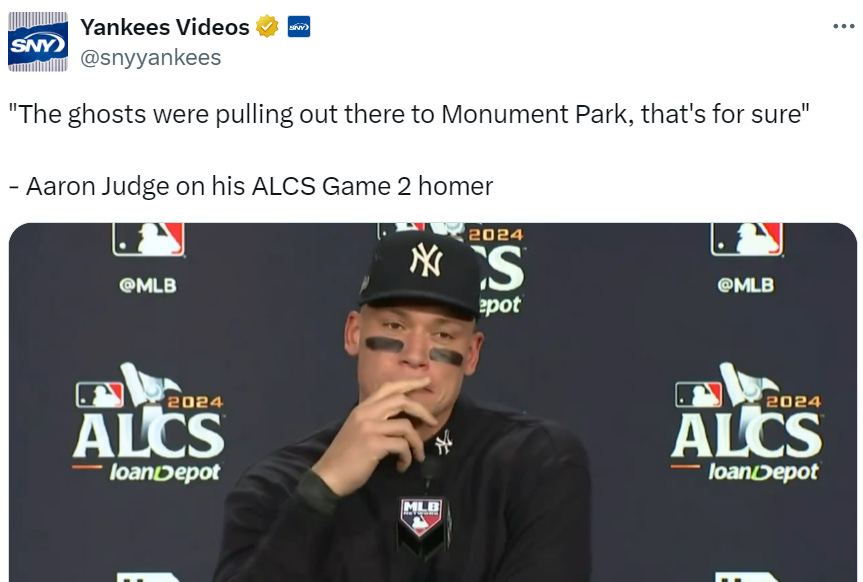 Or better yet, they may have found a way to use them to their advantage. In Game 2 of the ALCS, Aaron Judge finally hit his first home run of the playoffs, a towering two-run shot to center field, that hung in the air for hours and hours before drifting over the wall and into Monument Park. You could say this was because it was windy that night, or because Judge had finally timed his swing correctly on the fastball after being woefully behind for five games, or because the pitch was still slightly higher than he expected it, causing a higher arc than normal. But after the game, Judge had only one explanation for why the ball cleared the fence: “The ghosts were pulling out there to Monument Park, that’s for sure.” May they continue to pull. Four more wins. Let’s go Yanks.